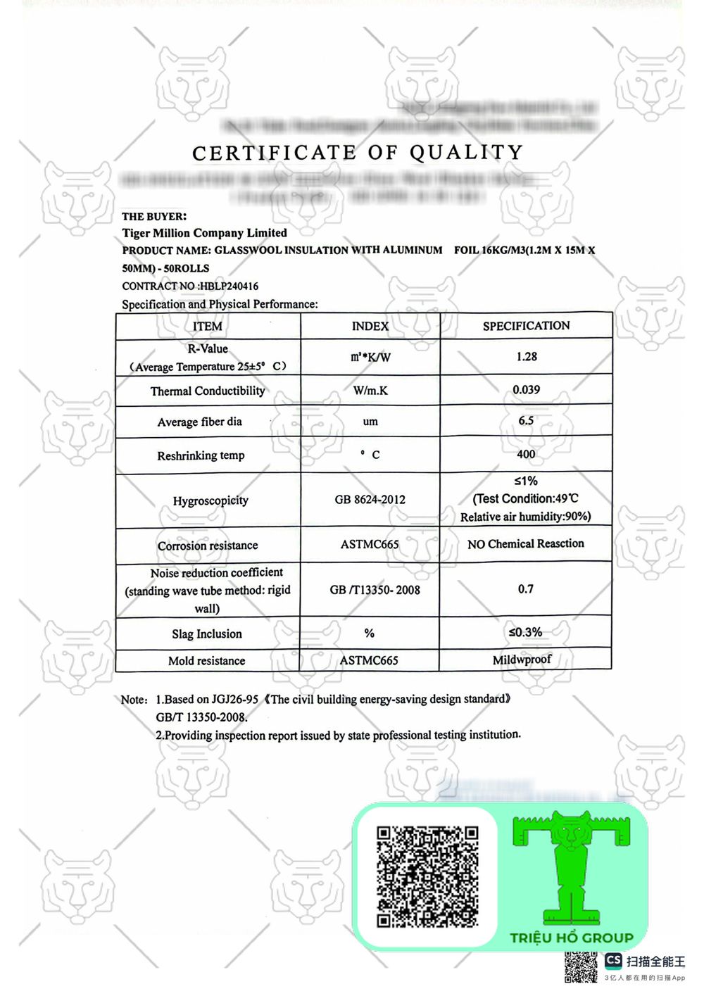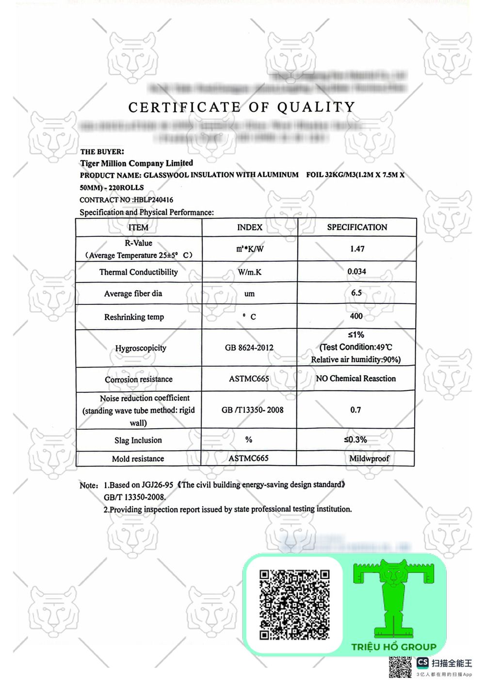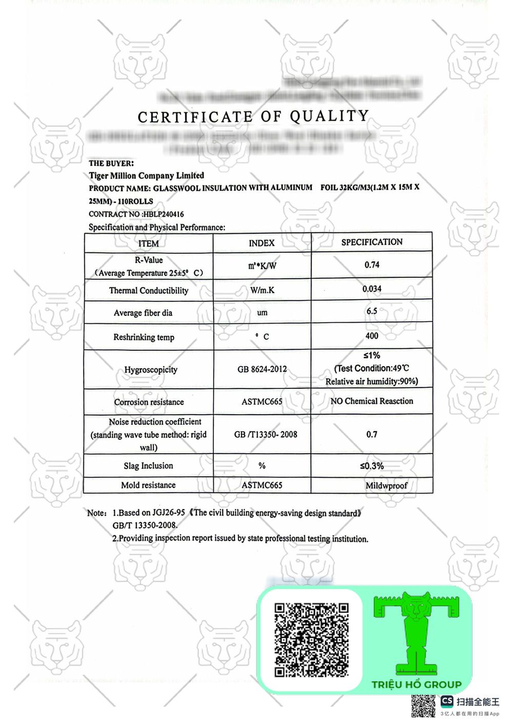 Chứng chỉ chất lượng Bông Khoáng