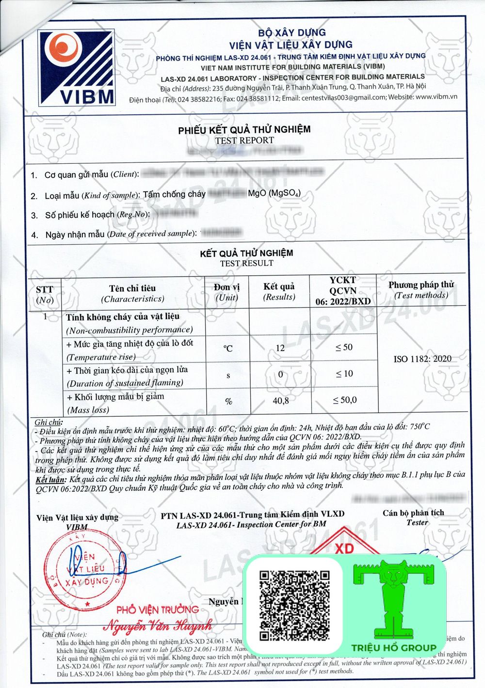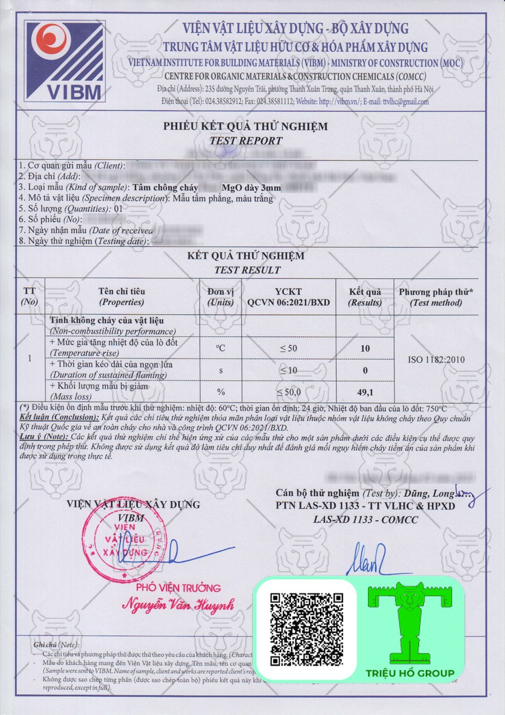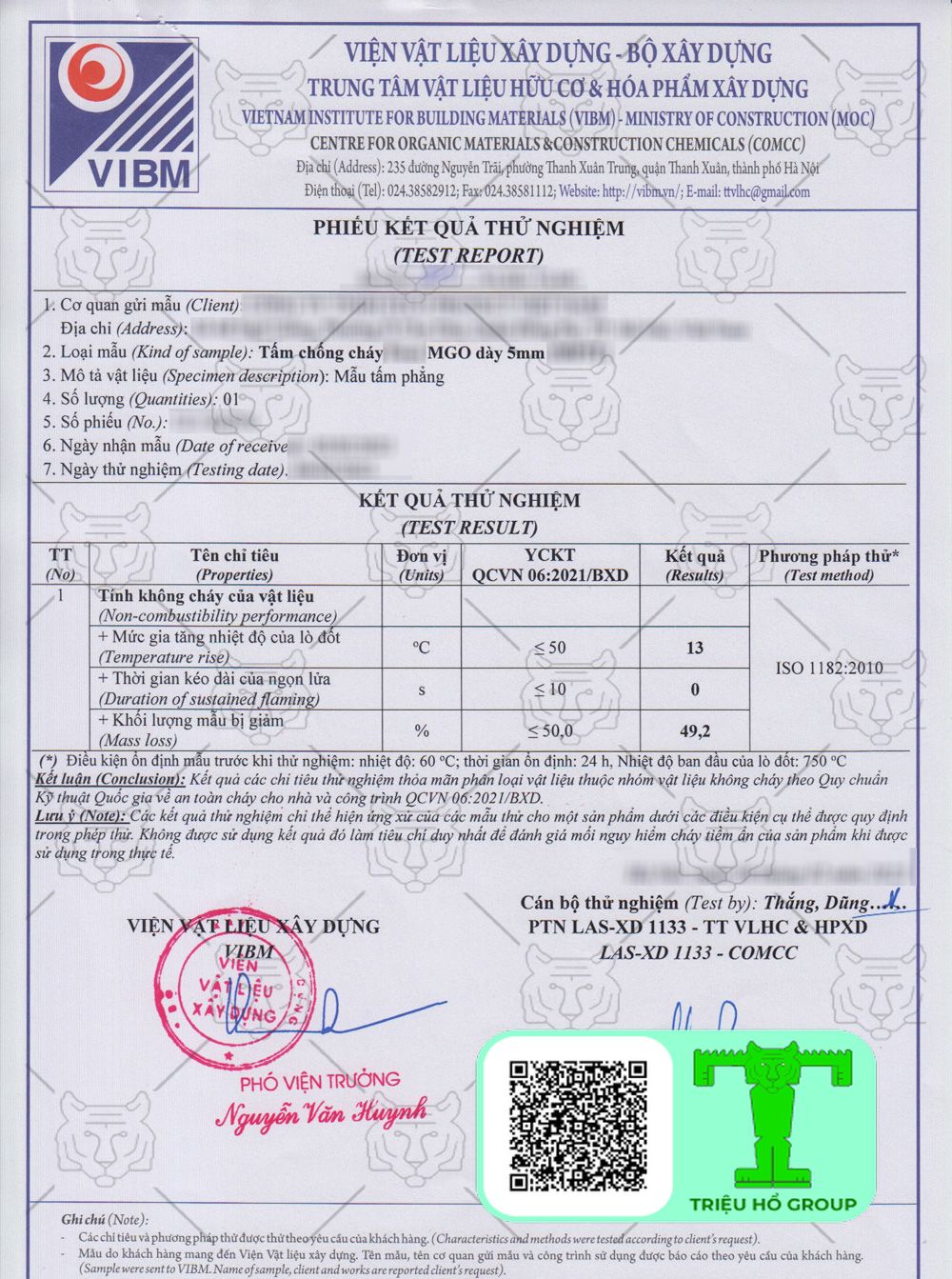 Chứng chỉ chất lượng tấm chống cháy MGO